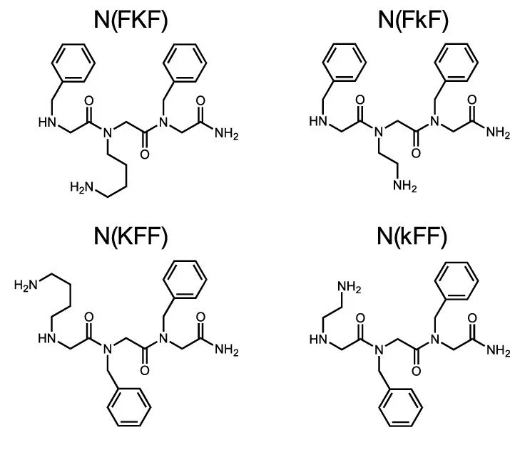 The peptoids from left to right, top to bottom can be written as NfNkNf, NfNkeNf, NkNfNf, NkeNfNf. Current naming emphasizes the peptide basis.