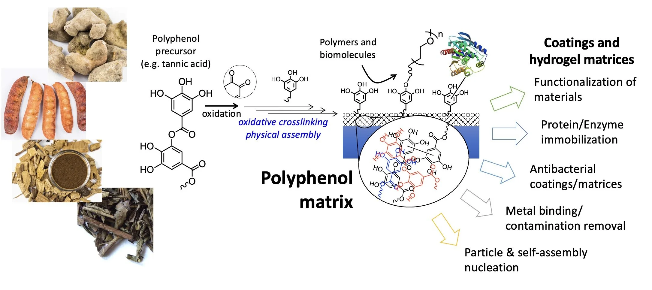 The generation of information rich biomimetic materials would also be facilitated by the development of chemically versatile and facile methods to combine different materials to form complex multifunctional structures. In particular, the convenient and chemically versatile polydopamine and polyphenol crosslinking chemistry is being exploited to functionalize material surfaces with diverse biomolecular elements, or to crosslink the biomolecules themselves into multifunctional clusters. Development of this chemically versatile platform will also cross-fertilize the research thrusts of peptoid interfaces and functionalized nanopores. Chemical versatility will also enable rapid screening of different functional combinations and accelerate the development of biointerfaces.